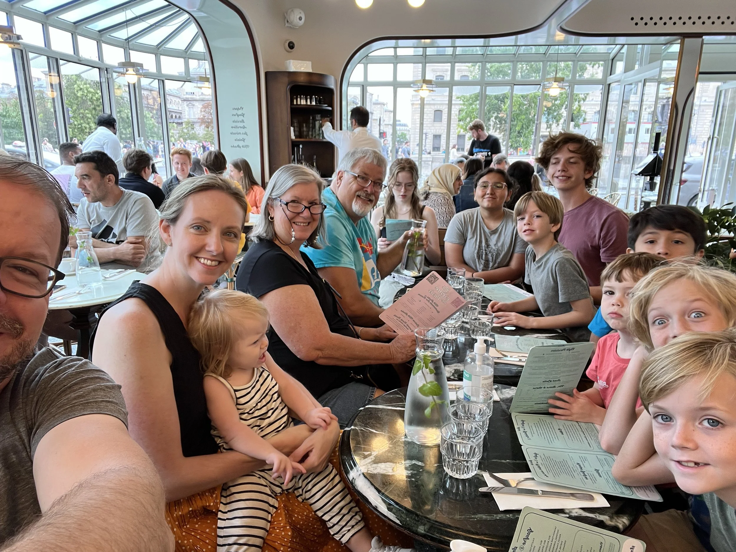 My wife and I have been married for over 22 years and we have a big crew. We decided a long time ago that we were not going to let that stop us so we travel all over, and take them all with us. The above is picture in a cafe near the Louve in Paris.